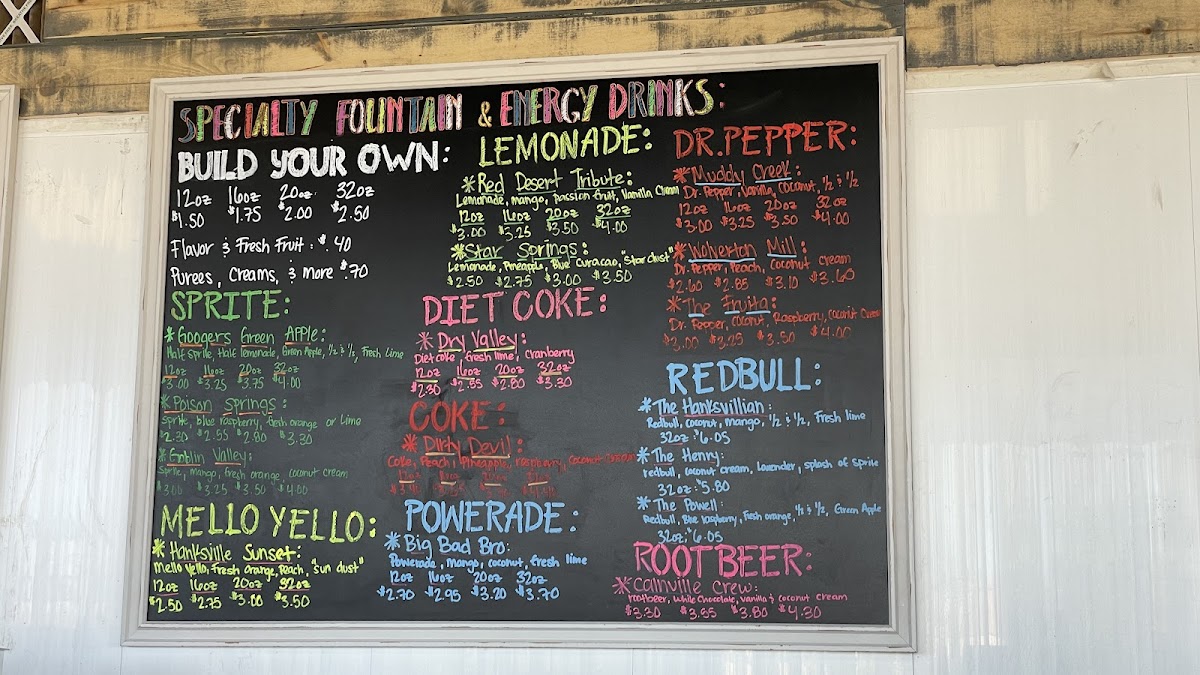 The menu features a rich selection of coffee and espresso drinks, including the robust Double Espresso and the sweet Caramel Macchiato, alongside specialty beverages creatively named after local landmarks. For a burst of energy, try the refreshing Goblin Valley drink or energizing Redbull blends.